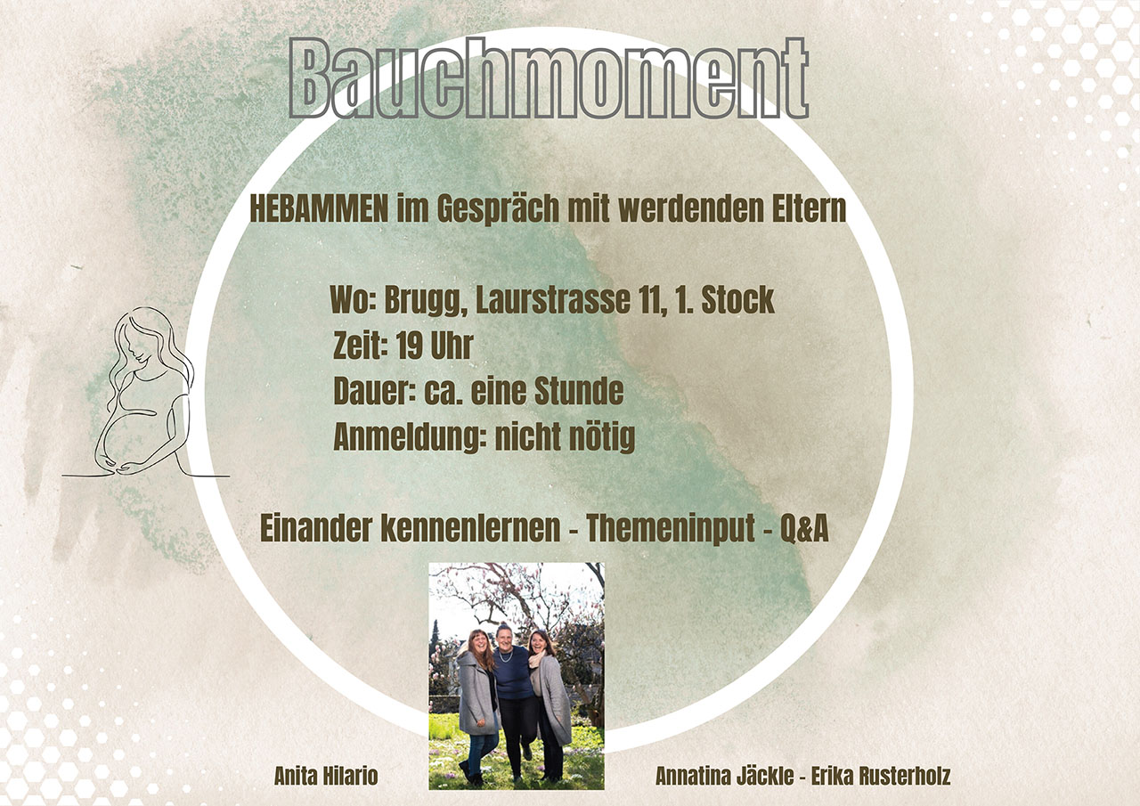 „Bauchmoment“ ist eine Infoveranstaltung von Hebammen für werdende Eltern. Mit einem kurzen Fachinput sprechen wir über wichtige Themen rund um die Geburt, das Wochenbett und übers Stillen.